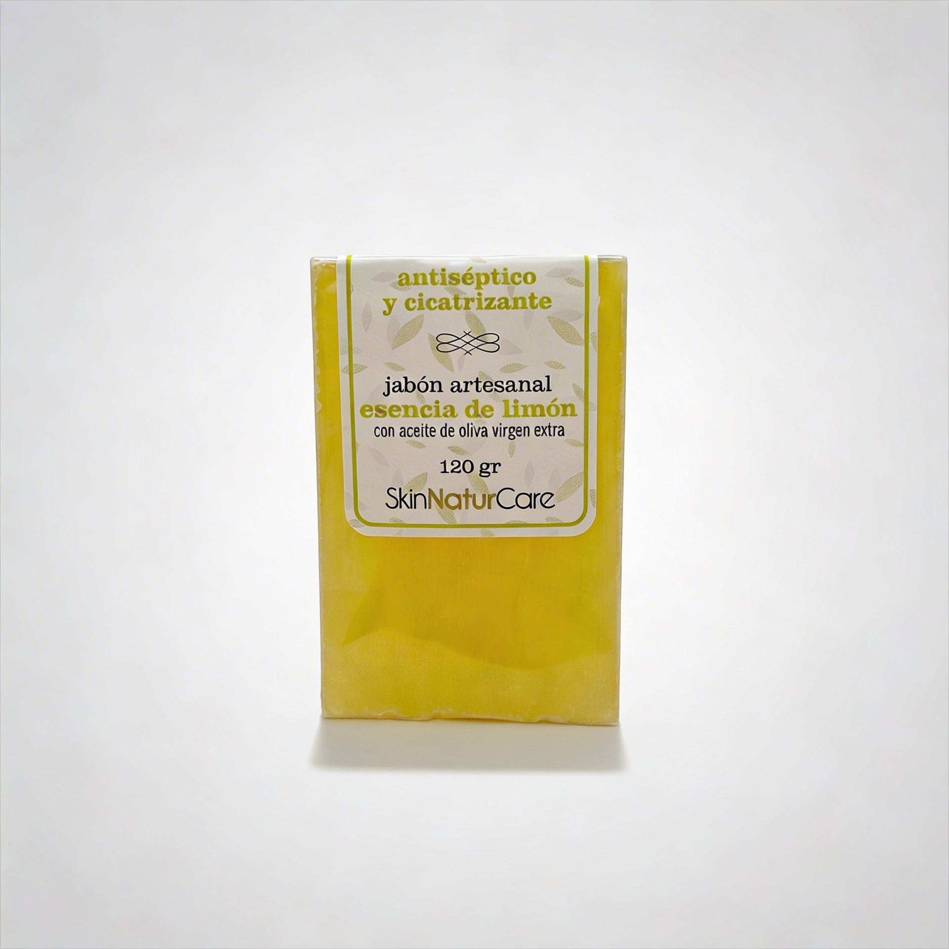 Jabón artesano con aroma cítrico y limpieza delicada. Jabón artesano con limón con AOVE para limpieza suave.