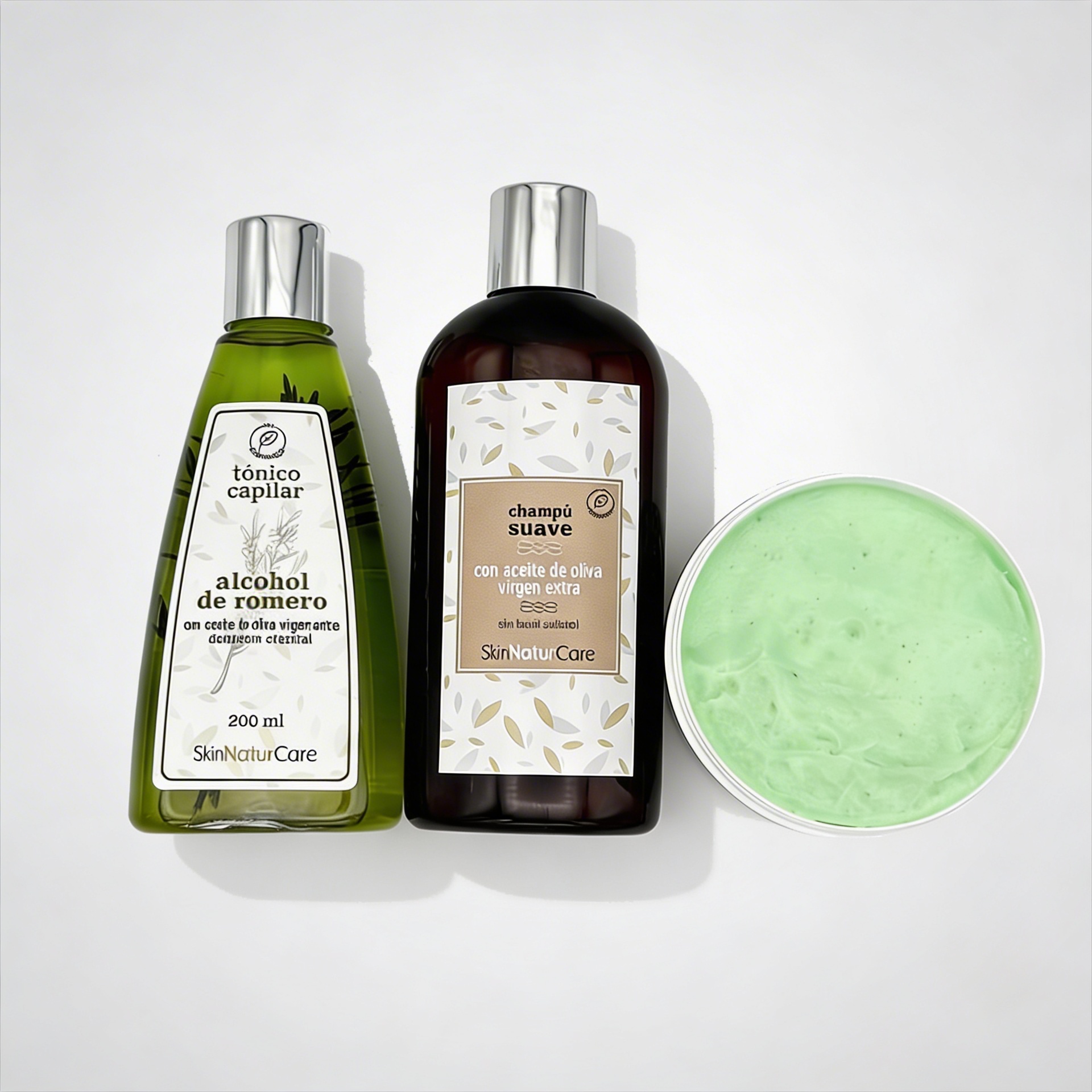 El champú suave con AOVE es ideal para el uso diario y todo tipo de cabellos. La mascarilla nutritiva con AOVE y queratina aporta nutrición, mejora la manejabilidad y ayuda a dejar el pelo más suave y brillante. Y como complemento, el alcohol de romero capilar se utiliza en fricciones y masajes del cuero cabelludo para una sensación revitalizante, tradicionalmente usado para ayudar a fortalecer el cabello.